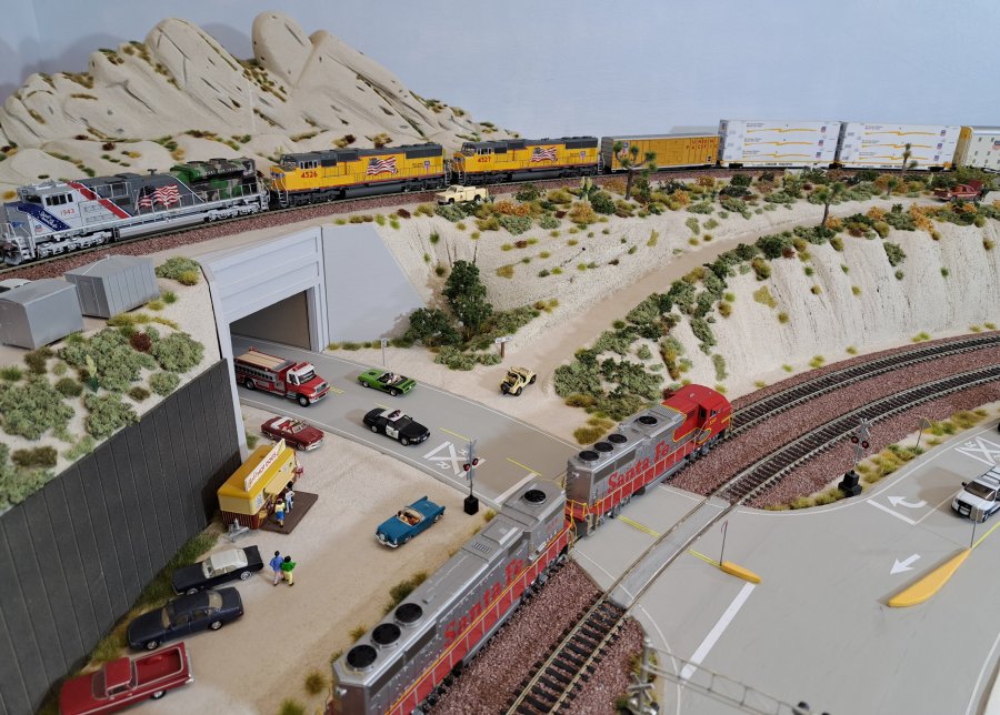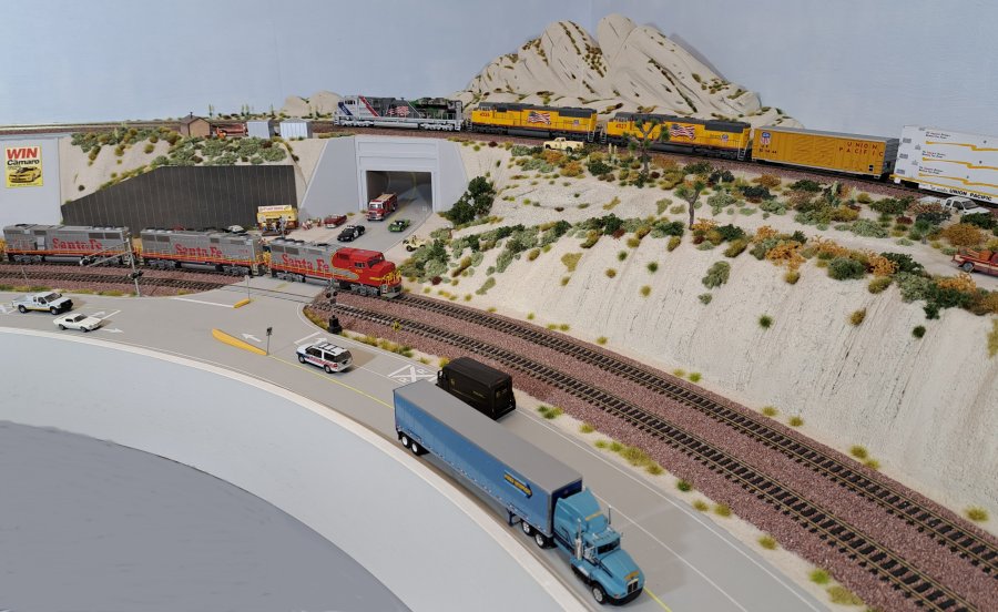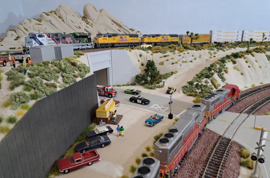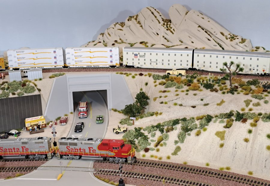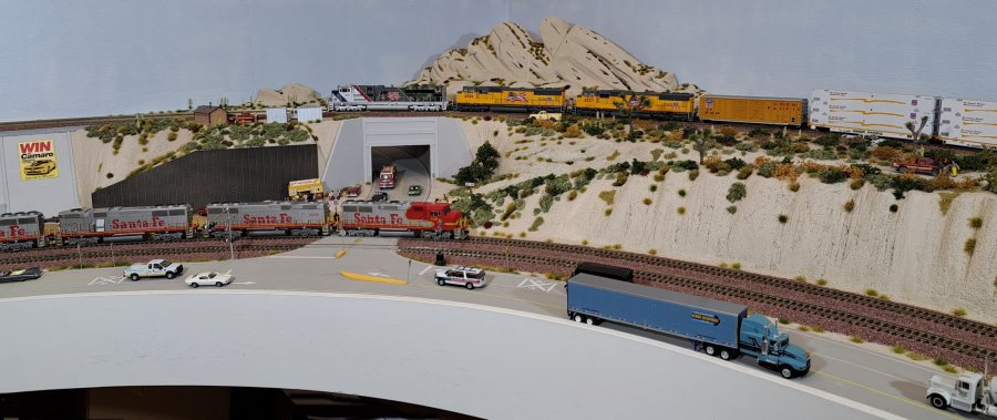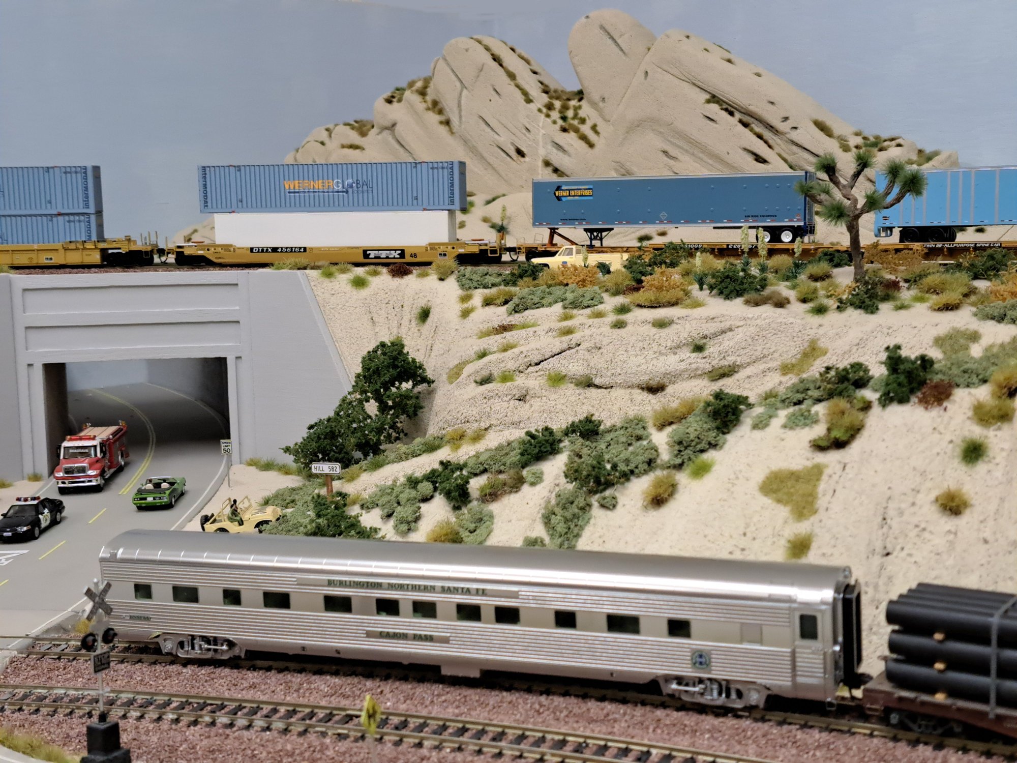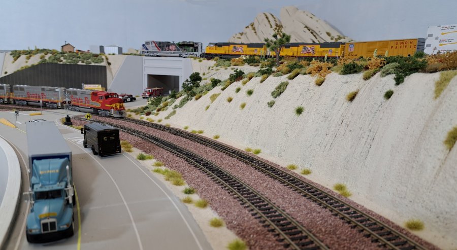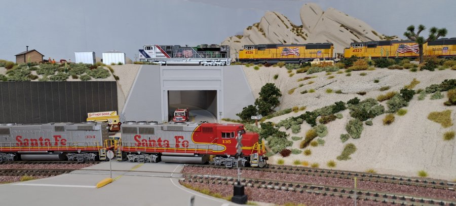 WL-3500 Yes, Highway 138 is passing the Mormon Rocks and the RR tracks, but is having 2 overpasses over BNSF MT-3 and BNSF MT-1 and 2 and 1 underpass under the UP track and the Mormon Rocks are just next to it. We also made a dirt road going to Hill 582 which would be much further away in real. Well these are the compromises in creating a model railroad with some famous icons included. |