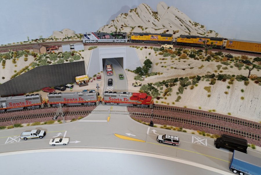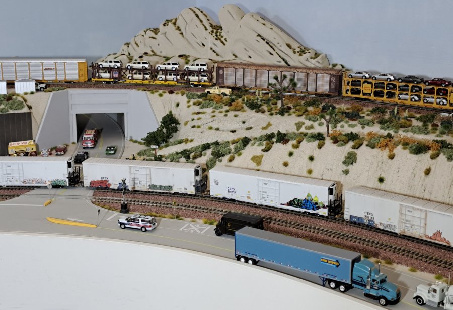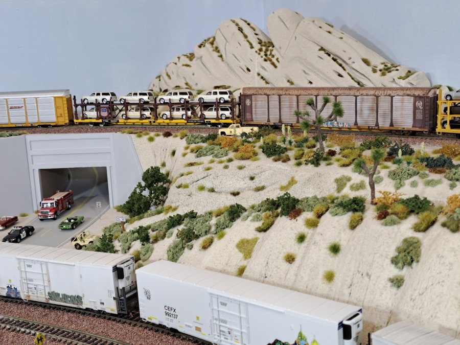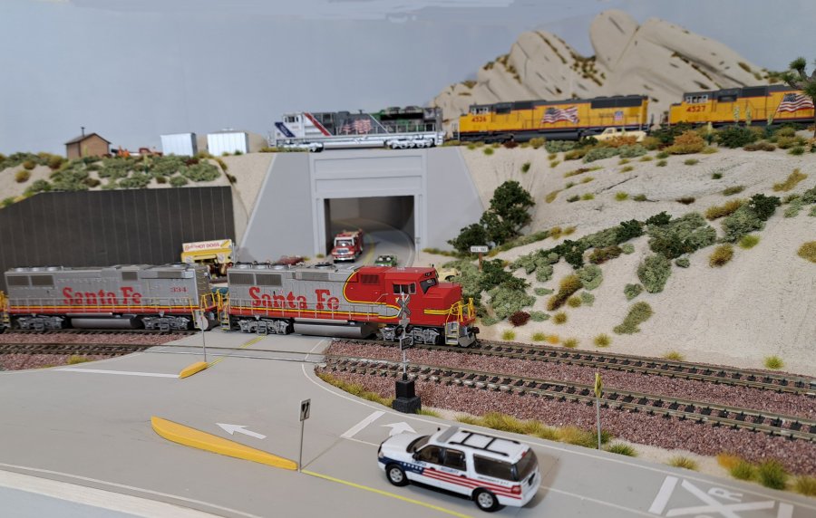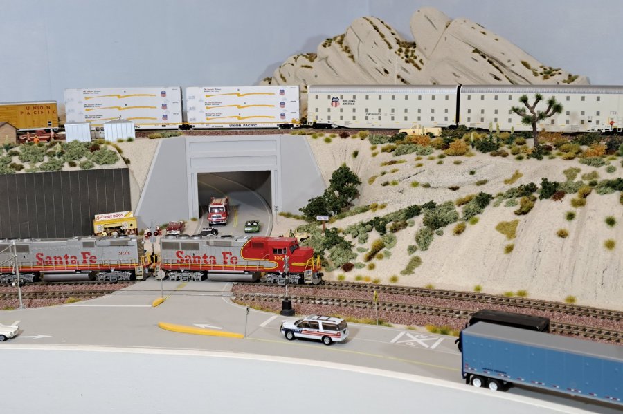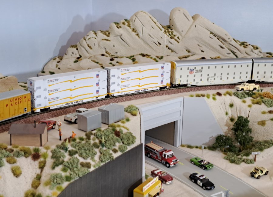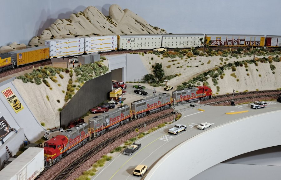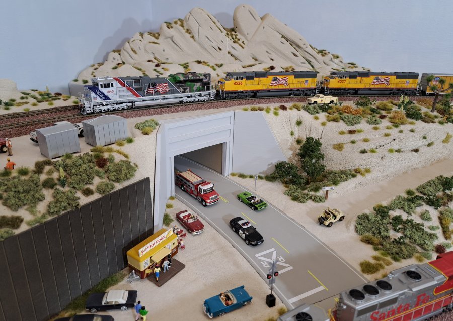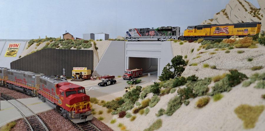 WL-3500 Yes, Highway 138 is passing the Mormon Rocks and the RR tracks, but is having 2 overpasses over BNSF MT-3 and BNSF MT-1 and 2 and 1 underpass under the UP track and the Mormon Rocks are just next to it. We also made a dirt road going to Hill 582 which would be much further away in real. Well these are the compromises in creating a model railroad with some famous icons included. |