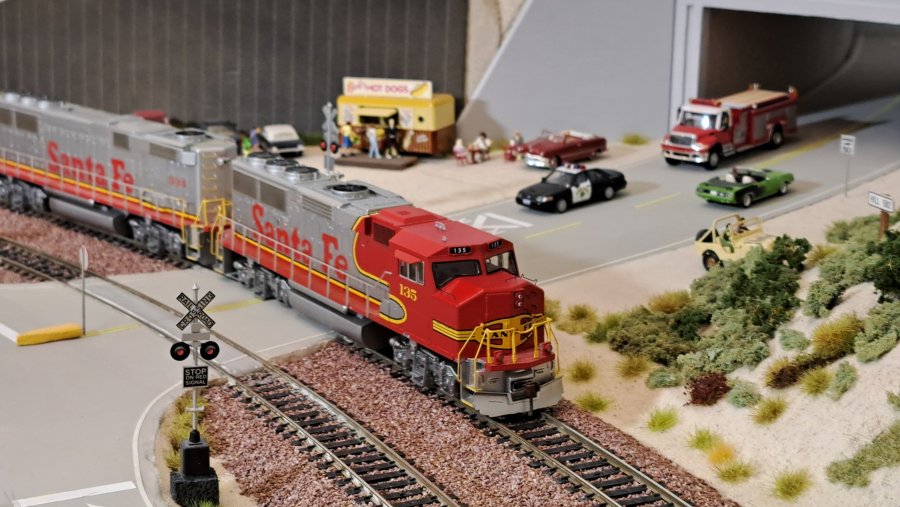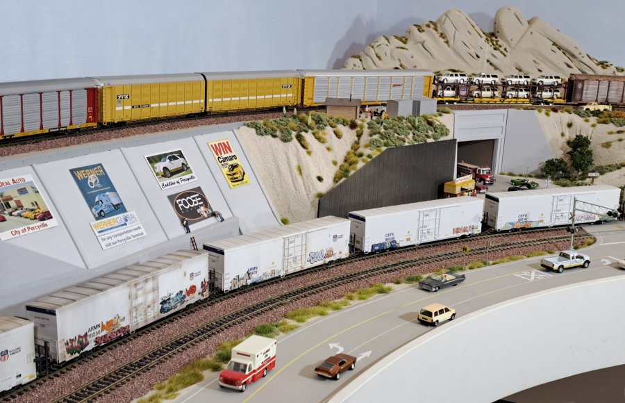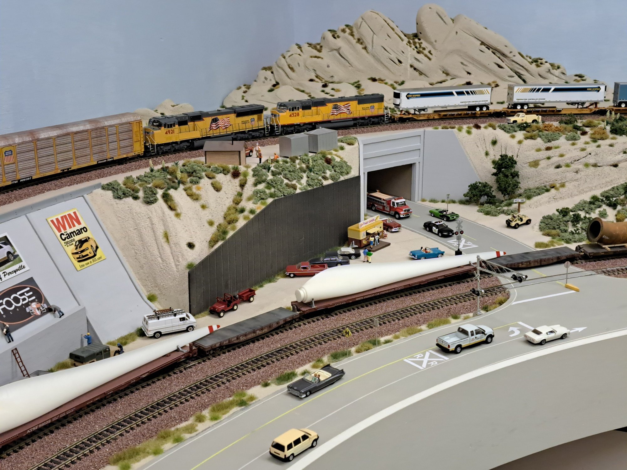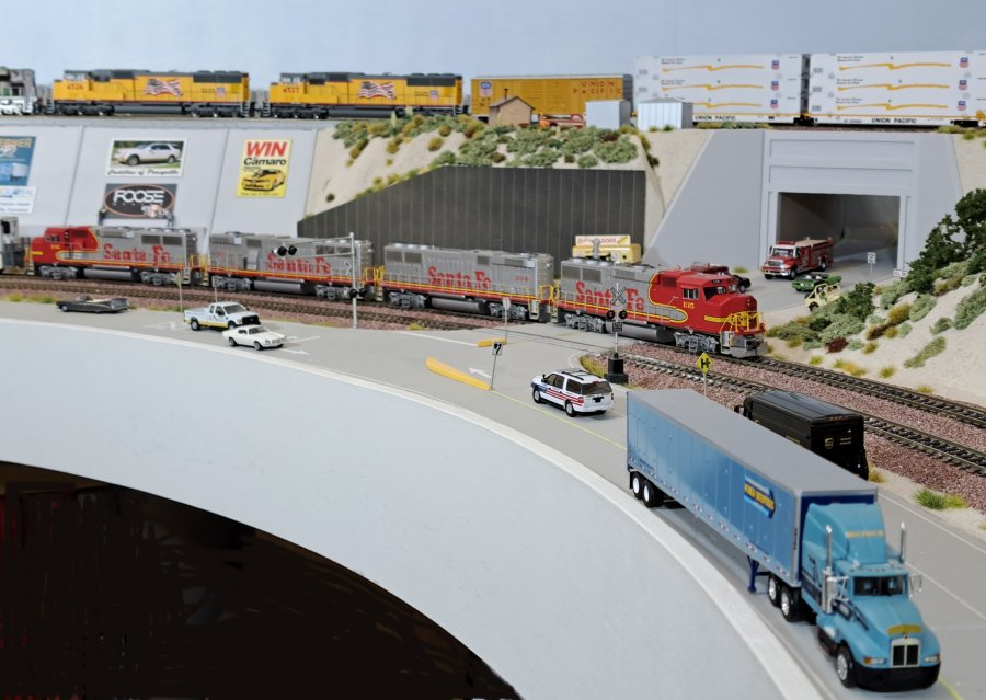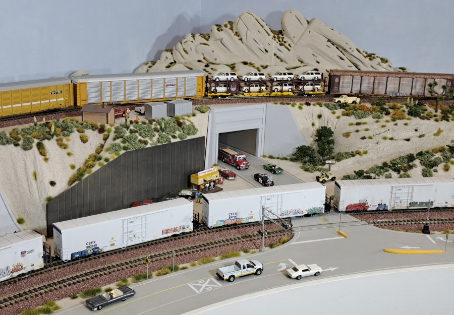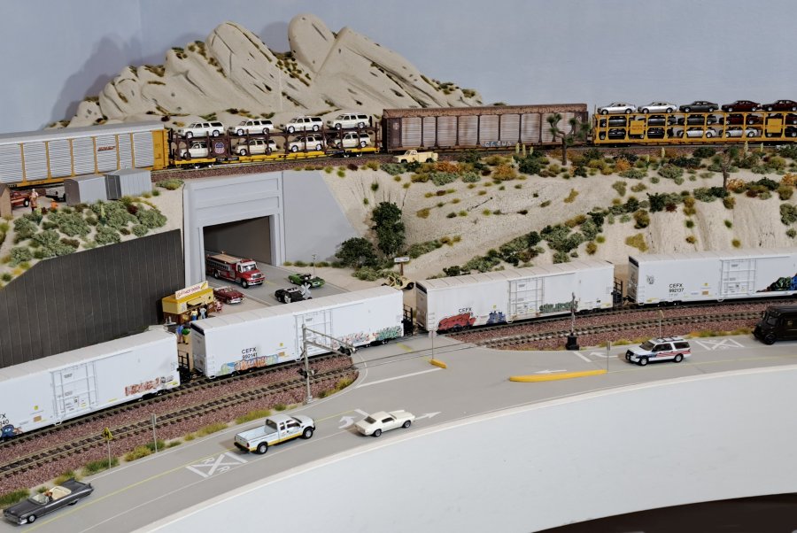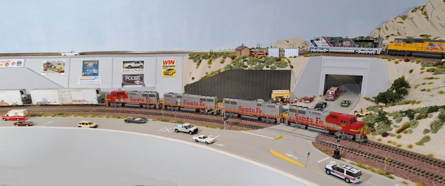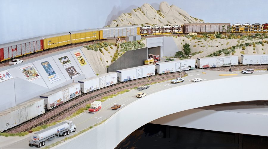 WL-3500 Yes, Highway 138 is passing the Mormon Rocks and the RR tracks, but is having 2 overpasses over BNSF MT-3 and BNSF MT-1 and 2 and 1 underpass under the UP track and the Mormon Rocks are just next to it. We also made a dirt road going to Hill 582 which would be much further away in real. Well these are the compromises in creating a model railroad with some famous icons included. |