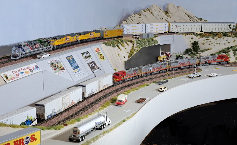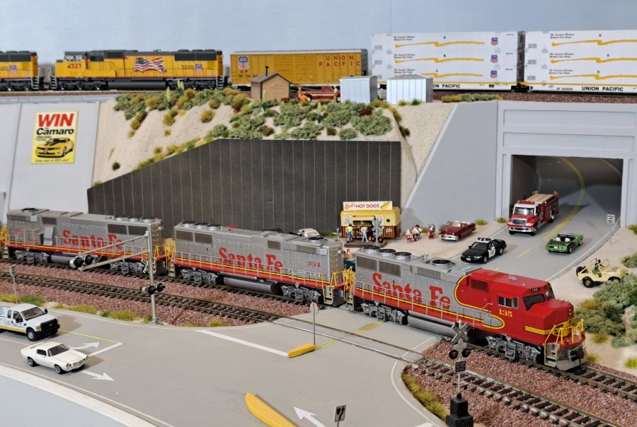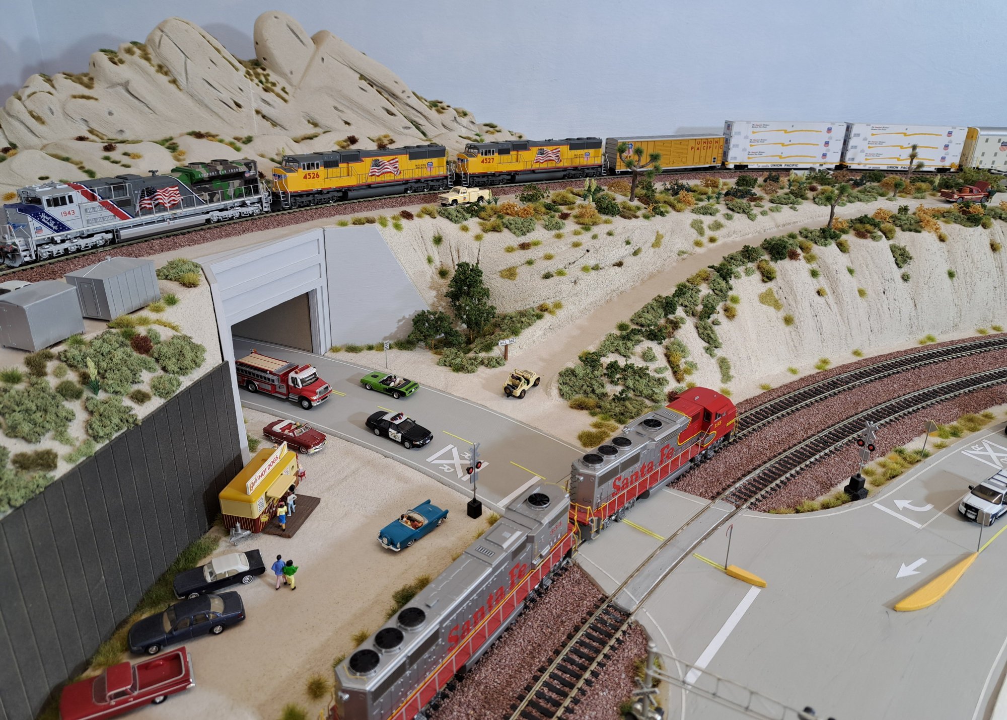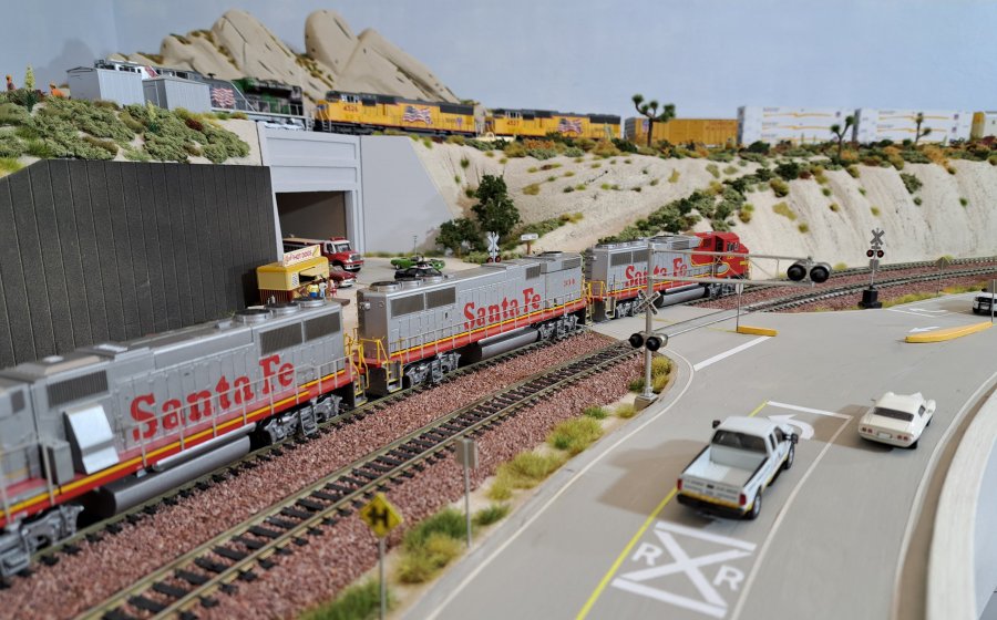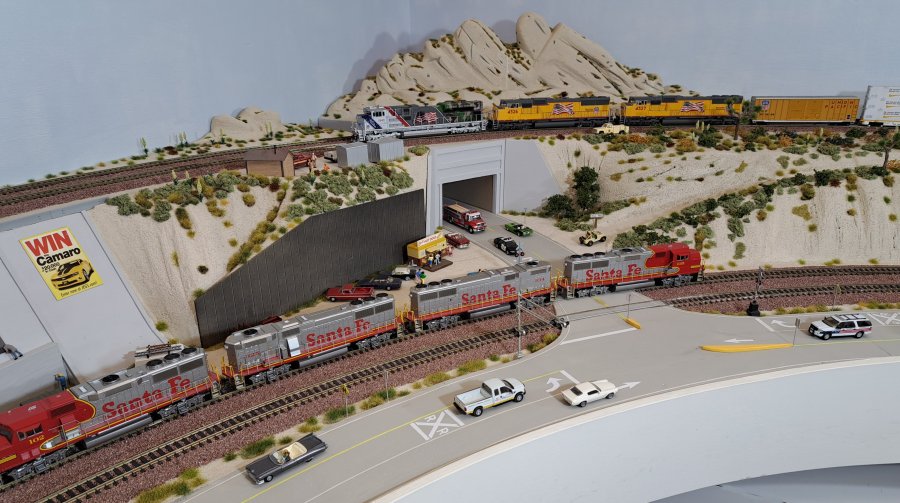 Inside Office 2 a Santa Fe train is leaving the short tunnel under the upper track toward the Mormon Rocks. WL-3495 |