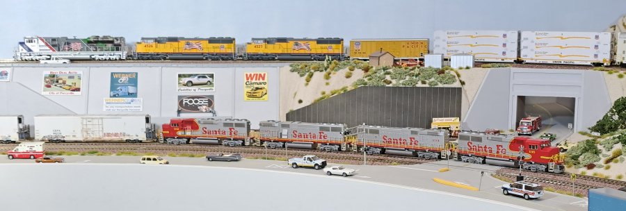 The Santa Fe train is going uphill toward the overpass and the UP train is going downhill toward the bridge leading into Office 1. WL-3627 |