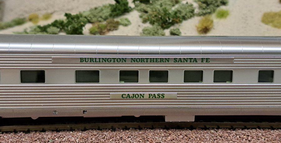 A special car "Cajon Pass" just passed Highway 138 and the Mormon Rocks. It belongs to the BNSF Business Car fleet. WL-3661 |