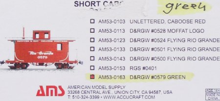 | Code AY-14: On3 Scale: AMS, D&RGW, Short Caboose # 0578 (green), sFr. 99.- consignment |