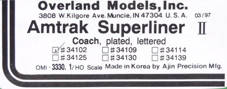 | Code GS-74: HO Scale: OMI # 3330.1, Amtrak, Superliner II F/P #34102, 3/97-run, sFr. 190.- consignment |