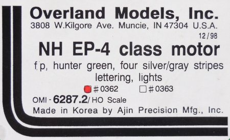 | Code GS-89: HO Scale: OMI # 6287.2, NH, EP-4 Eletric, F/P #362, lights, 12/98-run (39 of 42), sFr. 1150.- consignment |