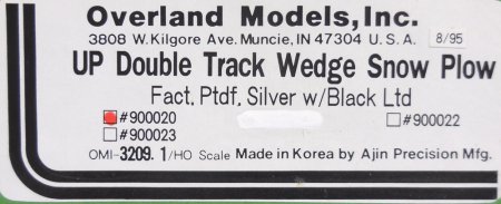 | Code GS-121: HO Scale: OMI # 3209.1, UP, Wedge Snow Plow, F/P #900020, 8/95-run, , sFr. 450.- consignment |