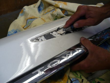| The Chrysler Wing Logo was removed and the rubber-glue had to be scratched off. |