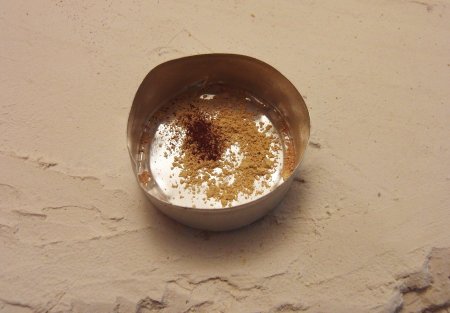 | 29. Anschliessend wird dick Acrylfarbe aufgetragen. | 30. In die noch feuchte Farbe streue ich einen extrem feinen Sand. Beim Sand ist darauf zu achten, dass er eine gleichmässige Körnung aufweist. |