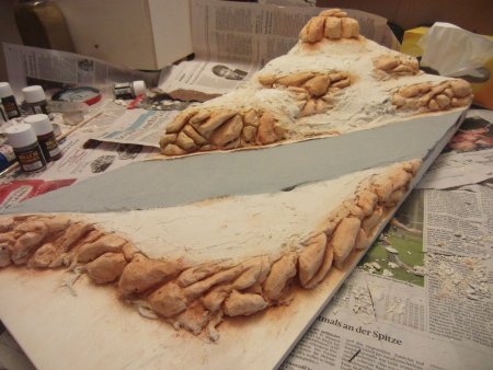 | 13. Nachdem der Gips ein bisschen angehärtet ist (ca. nach 30 min), lässt er sich immer noch mit dem Spachtel bearbeiten. Nun lassen sich Dellen am besten ausbessern, indem man mit dem Spachtel über den Gips ¨kratzt¨. | 14. Als nächstes wird der Gips für die Felsen aufgetragen. Dieser basiert auf Gips und eignet sich hervorragend für die Gestaltung von Felsen, da er sehr langsam aushärtet. |