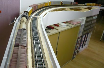 | 2/17/08 My 6-track hidden staging yard is finished. Each track is almost 4 m long (approx. 12 feet). This yard is resting on a wall mounted shelf and will be closed because on top will be the main line with a 1,5 % descent. The clearance between the double stack and the riser is 10 mm. - 123 | |
