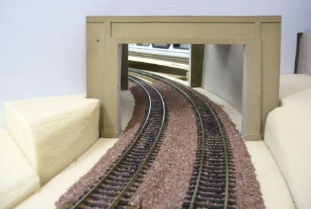 | 10/25/08: As mentioned above, I made a break on the bridge / tunnel section. I am currently concentrating on the last part of the main street at the right side near the 2 tunnels. Once again, I am using styrofoam for the ramp. With a short curve, the street will leave the layout before the tunnels. Behind the building will be a steep dirt road for access of the tunnel portals and the service road along the upper tracks. | |