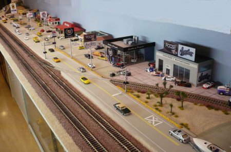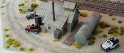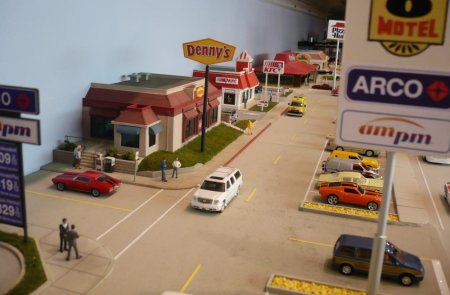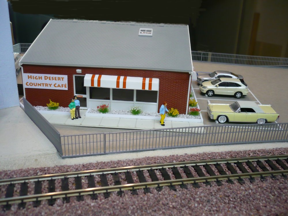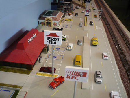 Here are photos of the real buildings (ARCO, Denny's, KFC) as located in Mojave, CA click here These 3 buildings on my layout were built by Pelle Soeeborg. |