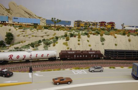 | Our journey with the Santa Fe train around the layout is over. But we are not at the end of the show, because we went back to the Flyover and the Mormon Rocks to show all the diffierent freight cars of this Santa Fe manifest. | |