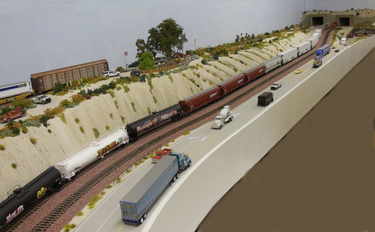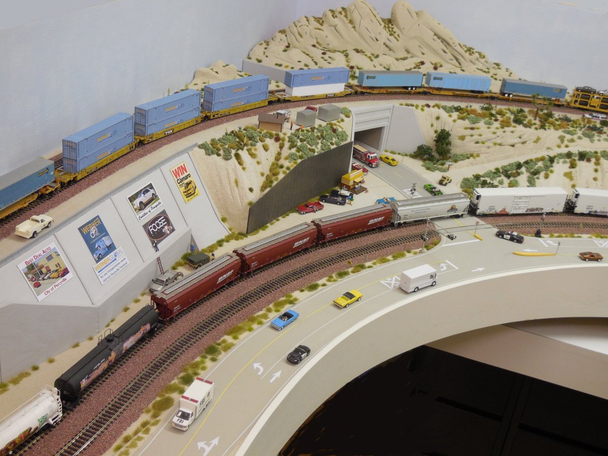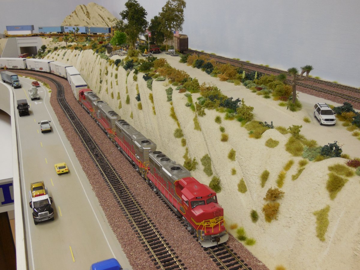 | My Santa Fe Train is "parked" inside Office 2 below Hill 582 and WSI, just before the Tunnels. First, we took some photos from the standing train, afterwards, the train was moving thru Tunnel 1 into Office 1 and over the bridge back into Office 2 along the shelf (next to the UP train). | |