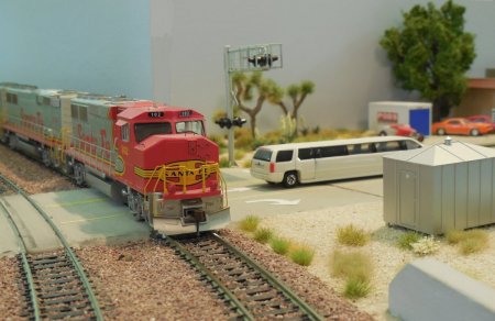 Union Pacific and Santa Fe Trains are rolling As the layout is more or less finished, I was putting two trains together and made testruns. Well, the real problems are becoming reality. Sometimes, locos or cars are uncoupling and as longer a train is getting, more power is needed. |