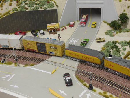 | After passing the bridge, the turbine reached the next part of the layout and is crossing Route 66. | |