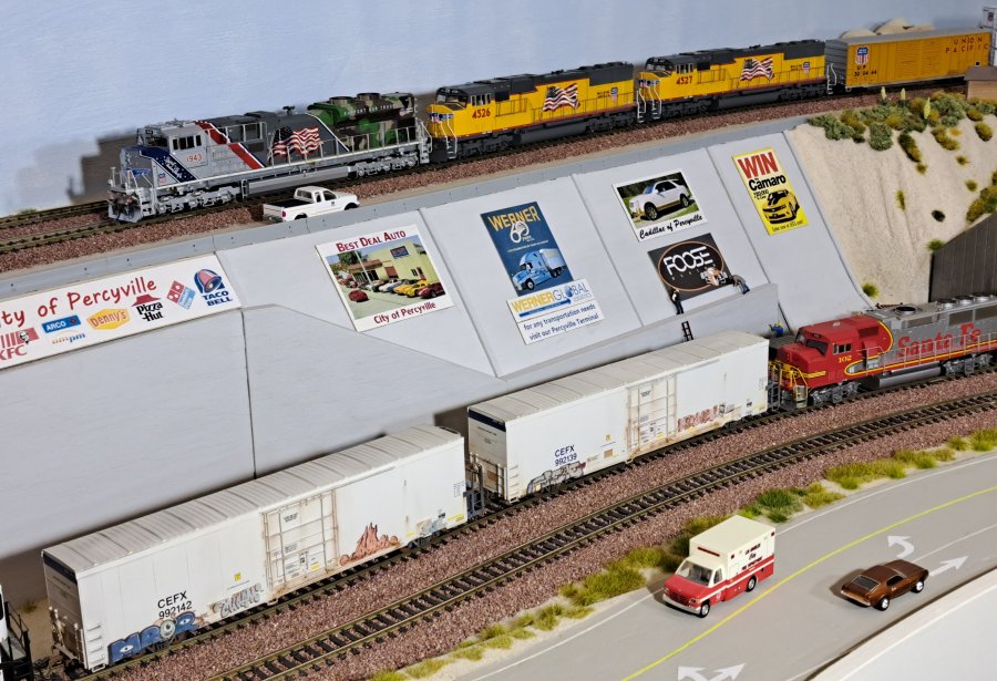 | The Santa Fe train is going uphill toward the overpass and the UP train is going downhill toward the bridge leading into Office 1. WL-3627 |