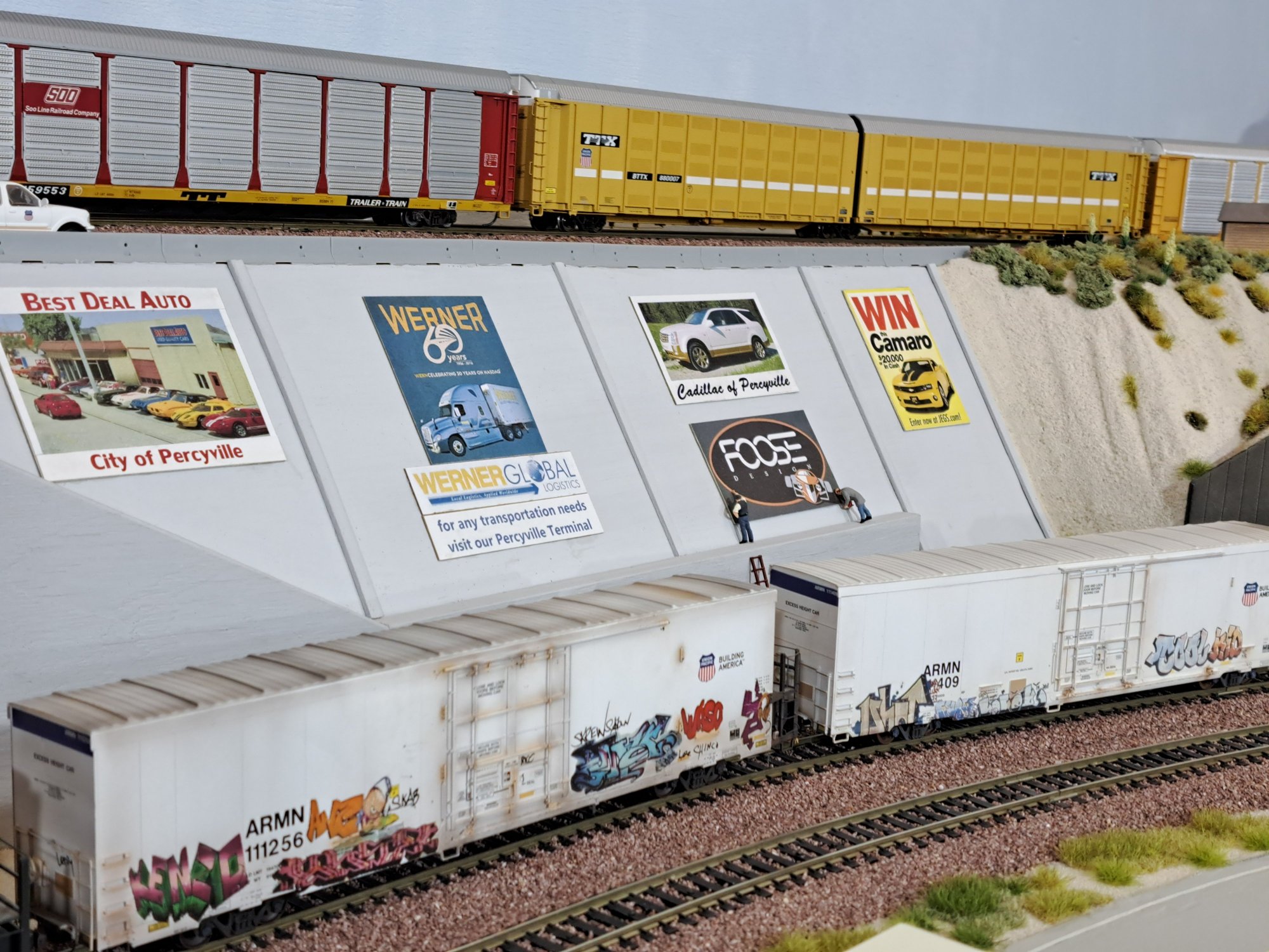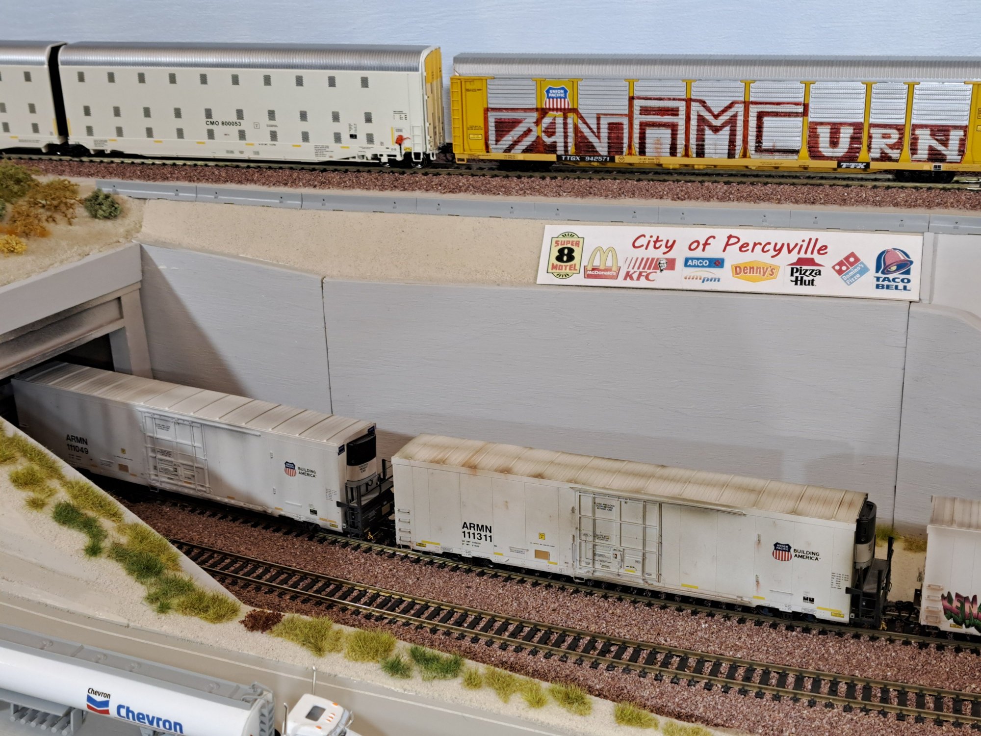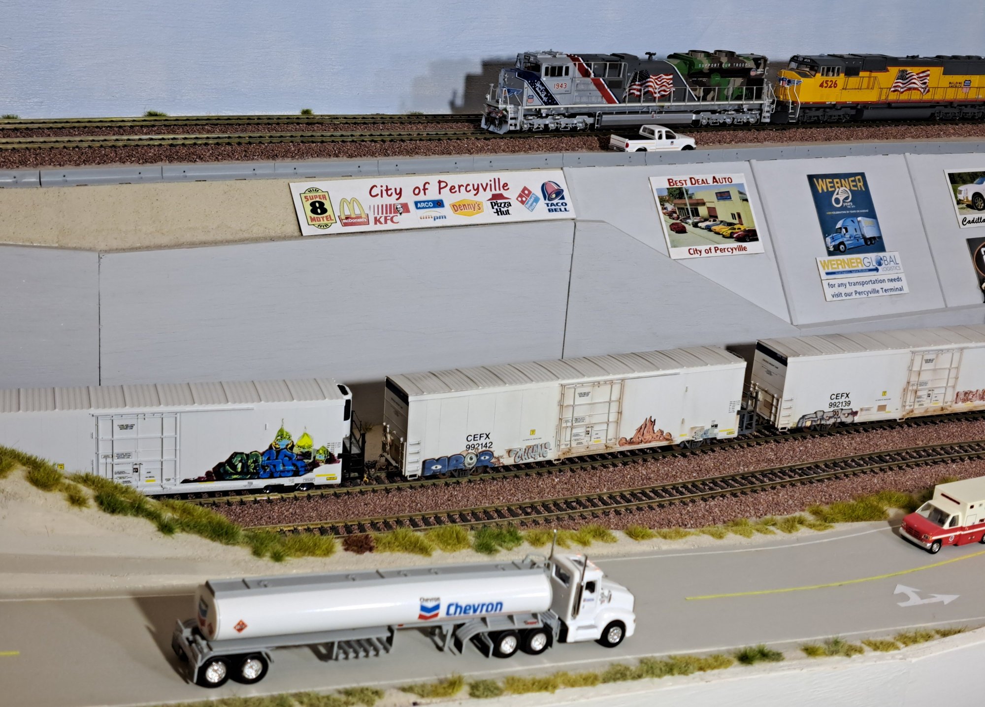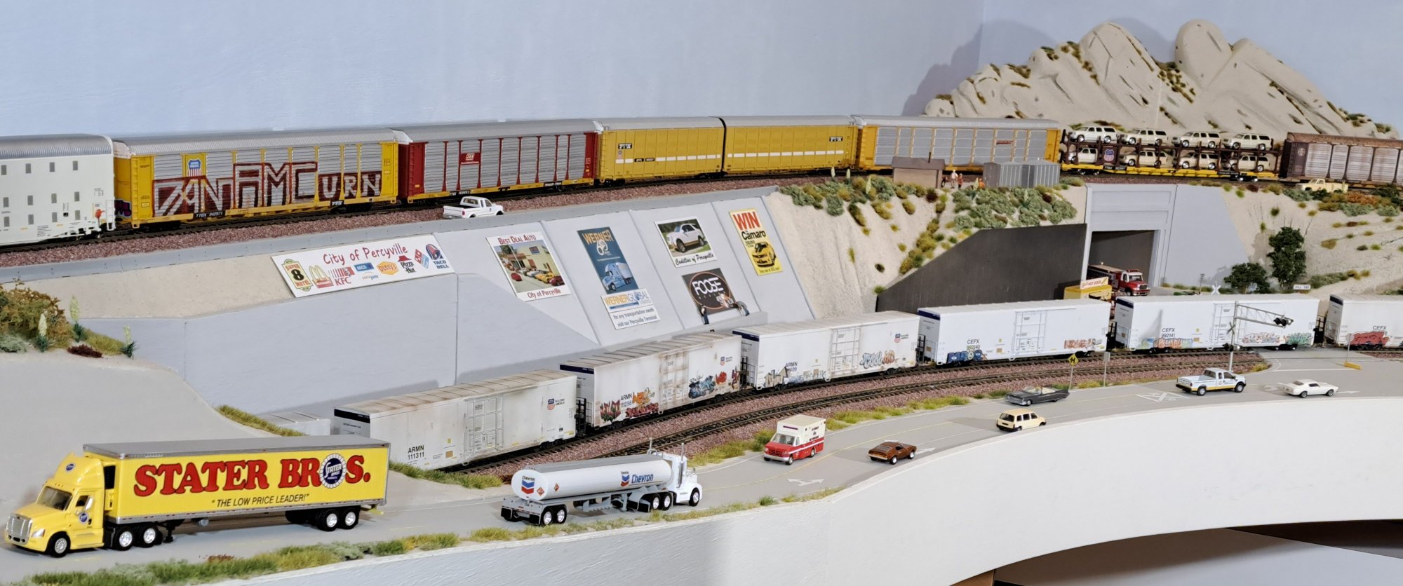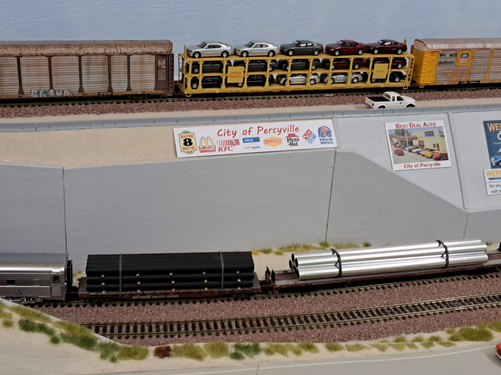 | Above the City of Percyville sign we are having a load of 15 Dodge Chargers inside the open autorack. WL-3636 |
