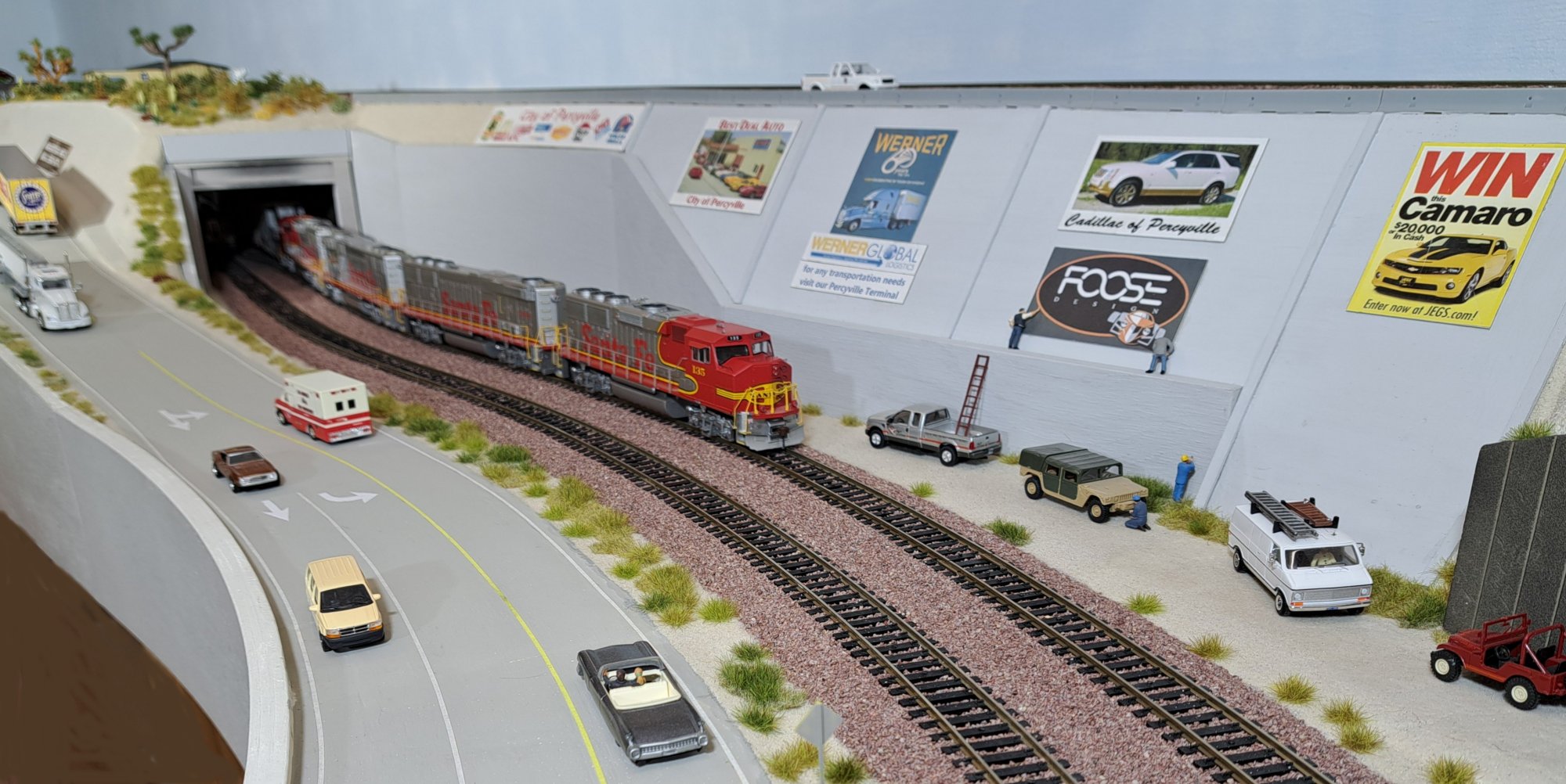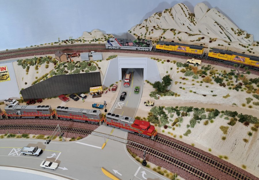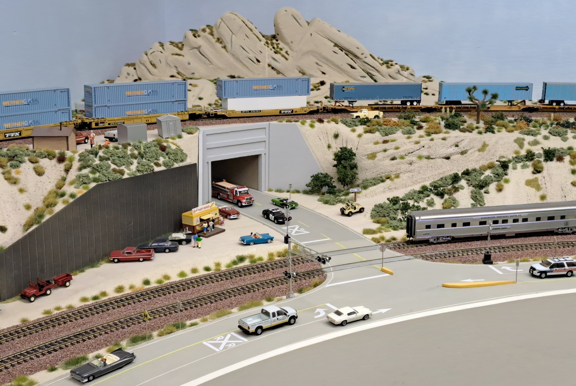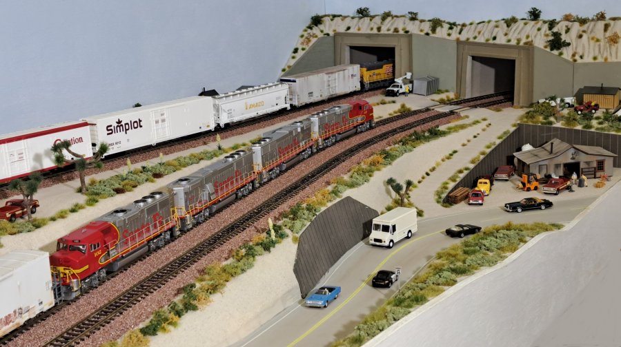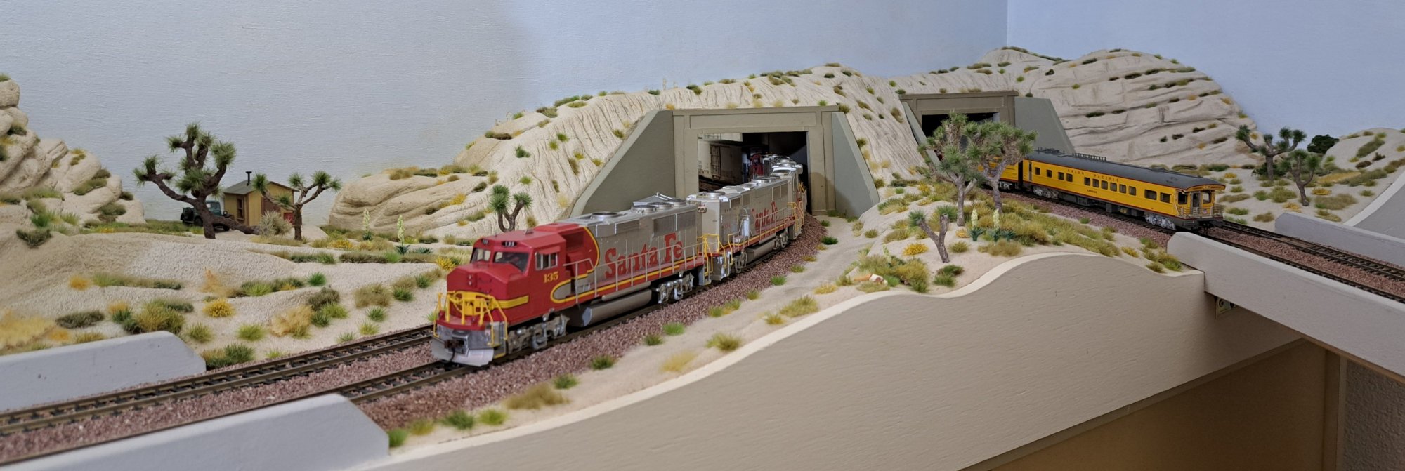 | Inside Office 2 a Santa Fe train is leaving the short tunnel under the upper track toward the Mormon Rocks. WL-3495 |