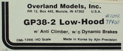 Overland Models # 1866, Toledo, Peoria & Western, EMD GP38-2, custom ptd. by Omi, PDP-20/21, je sFr. 400.- (consignment) sold out 2/10