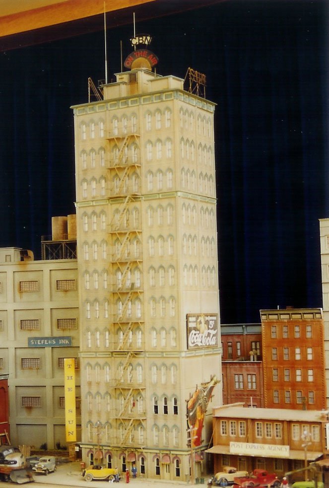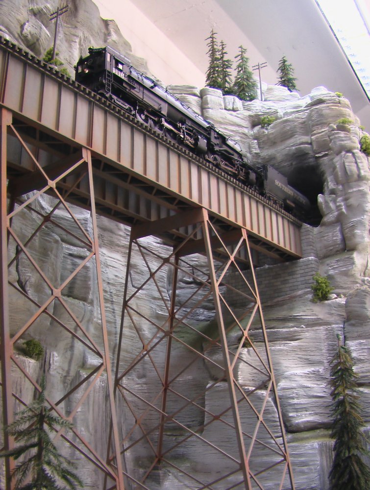 The beginning of the engine service complex with oil and lubrication facilities. Belwo the bridge is a news stand. Inside the center building is a model railroad shop located. There is a small layout with a running Daylight train! Der Anfang vom Betriebswerk mit Oel und Schmieranlage. Unter der Brücke befindet sich ein Kiosk. Im mittleren Gebäude ist ein Modelleisenbahngeschäft untergebracht. Darin steht eine Modelleisenbahnanlage, auf der ein Daylight Zug seine Runden dreht! |