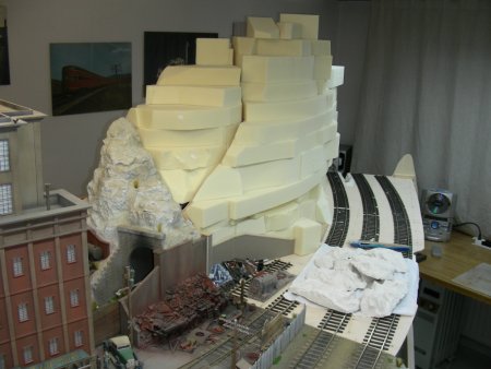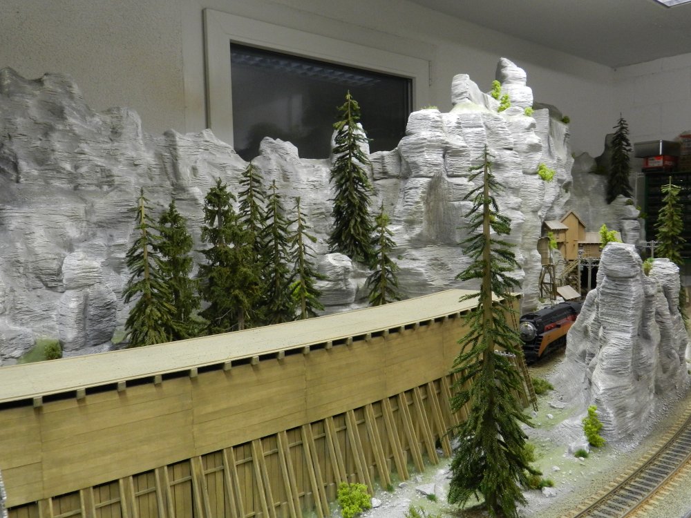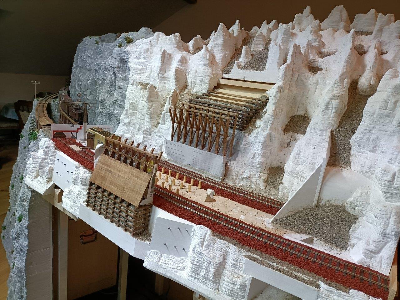 | I built the rocks with plaster and below is a skeleton of styro foam. The rocks are higher and the weight was increasing. I started to think of a lighter material to build the rock formations. - 035 | Die Felsen sind alle aus Gips gebaut worden, darunter ein Gerüst aus Styropor. Die Felsen wurden höher und das Gewicht nahm zu. Die ersten Überlegungen für leichteres Felsmaterial wurden gemacht. - 036 |