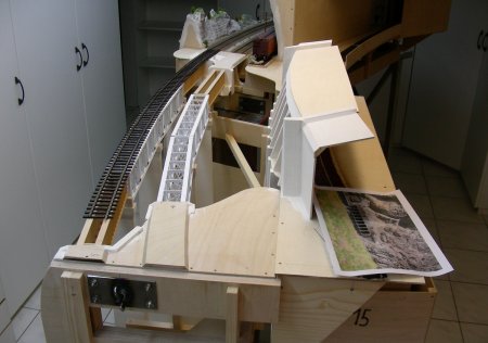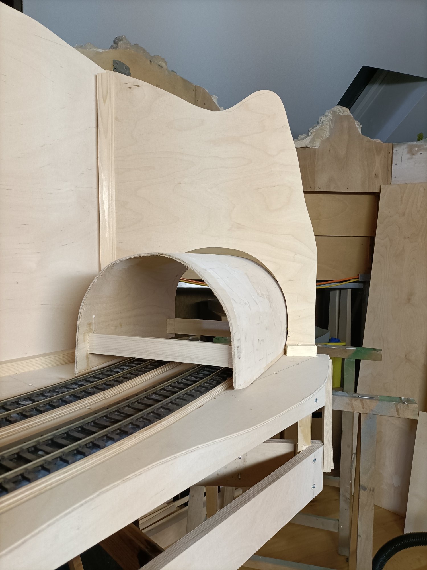 | 20. Februar 2016: Das Modul 15 wird auf der rechten Seite der Anlage aufgebaut. Die Stadt ist zu Ende und es geht auch da gleich in die Berge. Es ist das erste Modul das aus 4 Teilen besteht. So ist der Transport durch Engpässe ohne Probleme zu bewältigen. Zugleich ist es das erste mal, dank dem neuen Modul, dass ich mit einer Lok die 3 Gleiswechsel auf dem letzten Stadtmodul befahren kann. Das hintere Geleise im Tunnel sollte einmal zum Schattenbahnhof im Inneren der Anlage führen. Wie auf der linken Seite der Anlage werden die Berge auch hier bis zum Boden reichen. | |