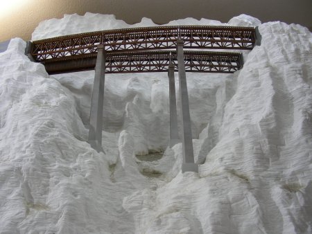 Also on this module, the rocks are going down to the floor. Therefore, I was able to build a spectacular bridge with a height of 110 cm (approx. 43"). Auch bei diesem Modul gehen die Felsen bis an den Boden. So konnte ich eine spektakuläre Brücke mit 110 cm Höhe bauen. |