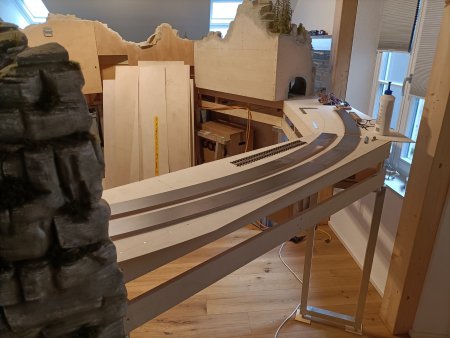 February 20, 2016: Module 15 will be built at the right side of the layout. The City is ending and it will go in the mountain area. Modul 15 is the first one existing of 4 parts. Therefore, transportation will be no proplam even going thru narrow places. Because of this new module, I will be able to use all 3 tracks from the City Module. The track behind will be used to reach the hidden staging yard. Like on the left part of the layout, the mountains will reach floor level. |