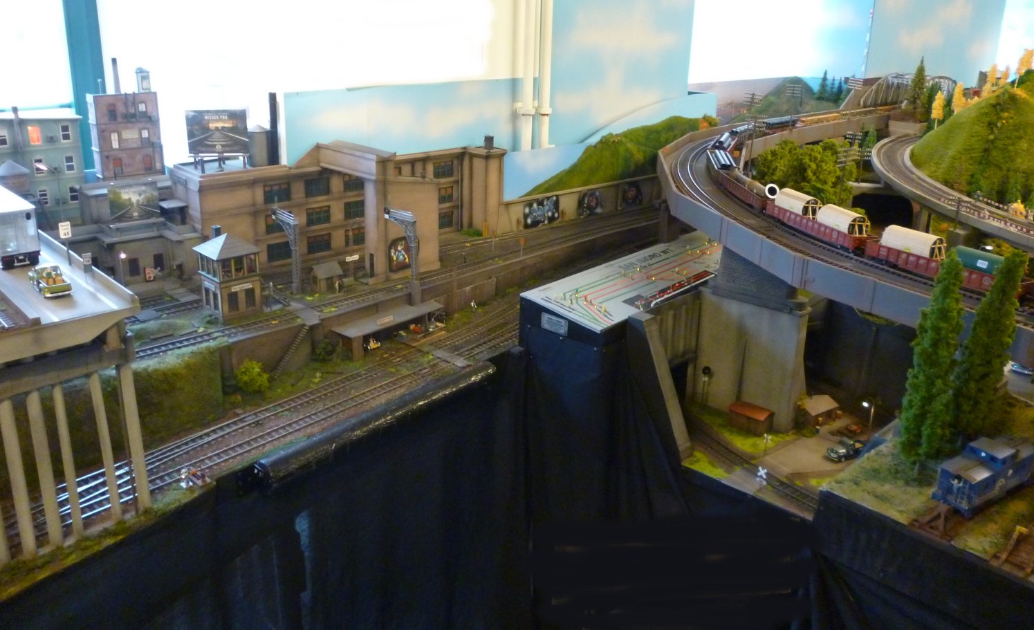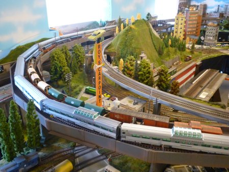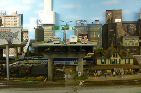 | 102 Übersicht / Diese Anlage wurde innerhalb von 20 Jahren aufgebaut. Die meisten Gebäude wurden im Eigenbau (scratchbuilt) erbaut. Dabei hat es auch viele Background Buildings an den Wänden entlang. Interessant sind auch die vielen Strassenbrücken und Details an jeder Ecke. |
