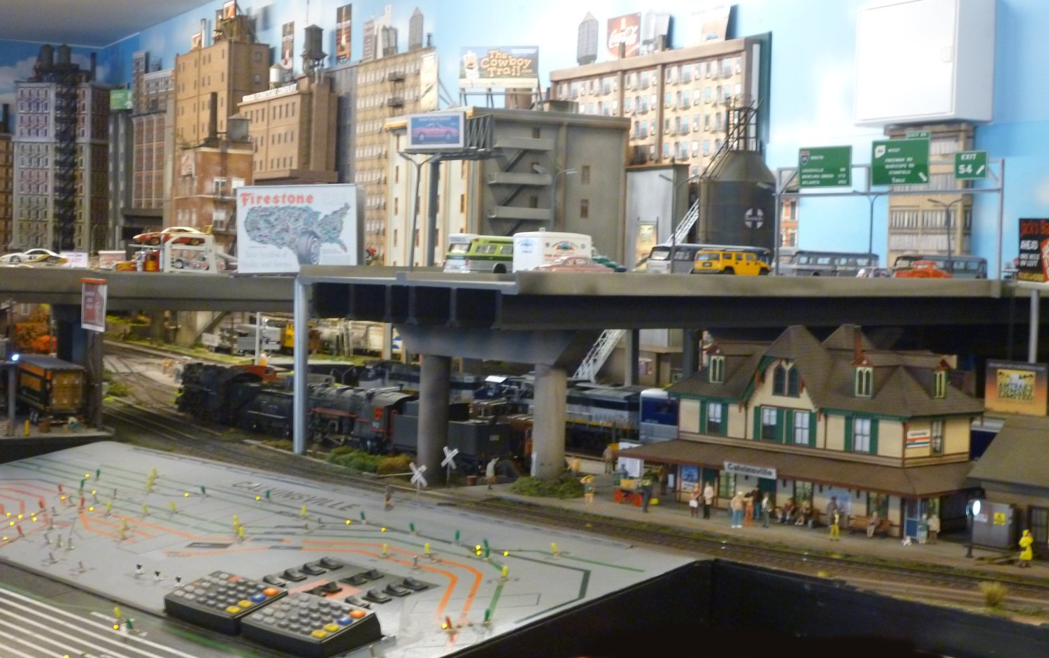 | Strecke, Gleismaterial: Als ich angefangen habe gab es hauptsächlich nur Peco und Roco. Mittlerweile habe ich auch Gleise verbaut von Atlas und Lenz. Gute Erfahrungen habe ich gemacht mit den simplen Roco Weichen. Die Weichenantriebe sind von Fulgurex. Robust und zuverlässig. Die meisten verrichten schon fast 20 Jahre problemlos ihren Dienst. Die Hauptstrecke ist einspurig. Es sind zwei verschachtelte Einspurstrecken mit einer separaten Einspeisung. Ein Zug hat ca. 12 Minuten die ganze Strecke abzufahren. Beginnend im Schattenbahnhof schlängelt sich der Zug durch den Haltepunkt Westwood um dann wieder im Untergrund zu verschwinden. Nach einer weiteren Schleife im Untergrund kommt der Zug ans Tageslicht um in einem grossen und steilen Bogen (ca. 30 Promille Steigung) auf die Ebene 0 zu gelangen. Die Fahrt geht durch San Isidro nach Calvinsville. Dann weiter über eine grosse, gebogene Rampe und Brücken über Calvinsville, zwischen den Häusern durch um schlussendlich in einer langen Abfahrt im Schattenbahnhof wieder zu verschwînden. Ich fahre Analog, zweileiter Gleichstrom. Es sind zwei Stromkreise vorhanden. Ich habe keine Blockabschnitte und fahre nur mit einem Zug dem ich meine volle Aufmerksamkeit widme. Es können sich zwei "Lokführer" beschäftigen und ein Fahrdienstleiter / Weichensteller in C-Ville und San Isidro. Der kleinste Radius ist 1,2 m im Untergrund, Im sichtbaren Bereich ist der grösste Radius ca. 2,2 m. Die Schienenlänge mit allen Abstellgeleisen ist ca. 400 Meter. Angrenzend an den Bahnhof C-Ville ist auch ein kleiner Güterbahnhof, allerdings alles Stumpengleise. |
