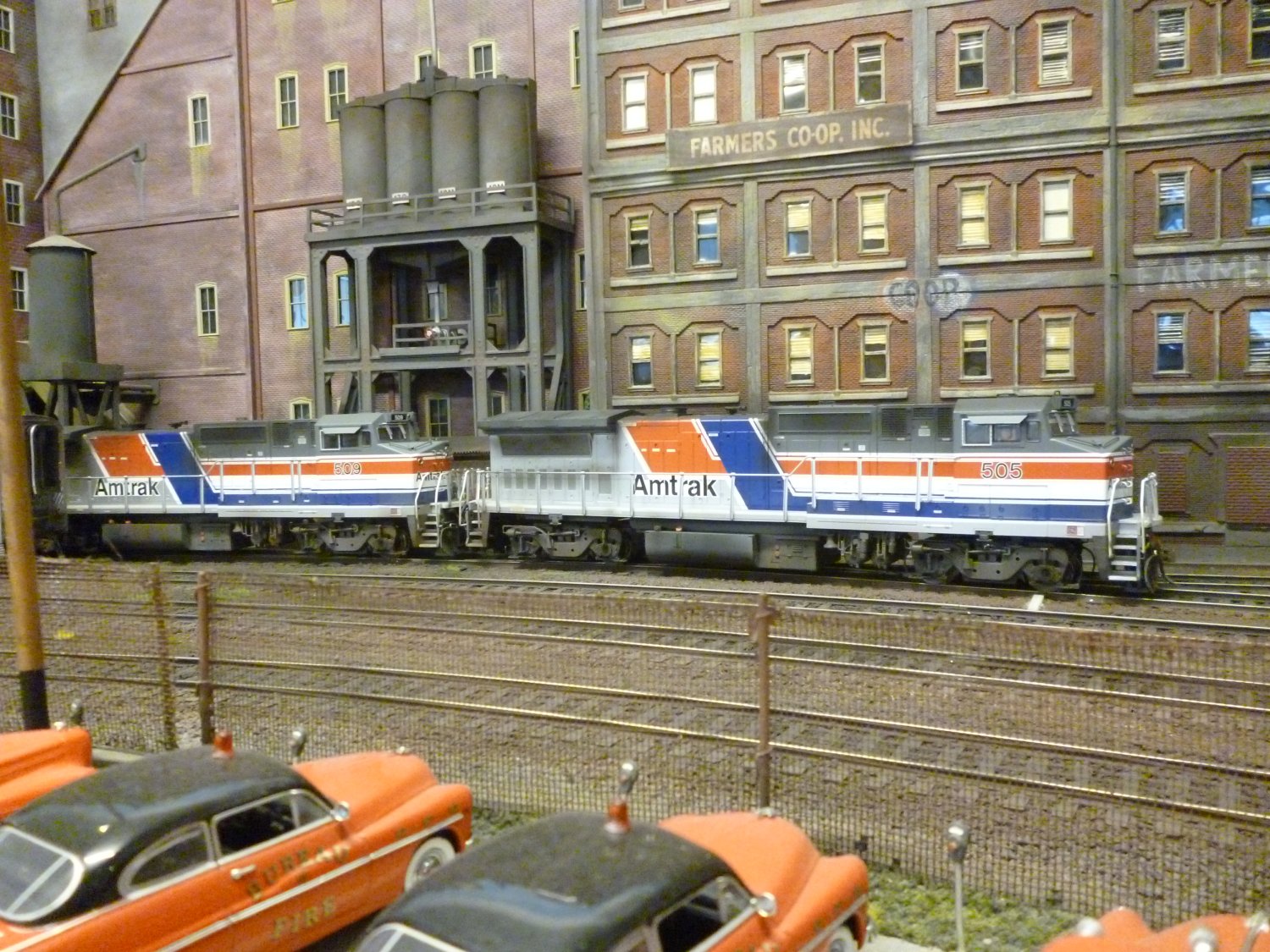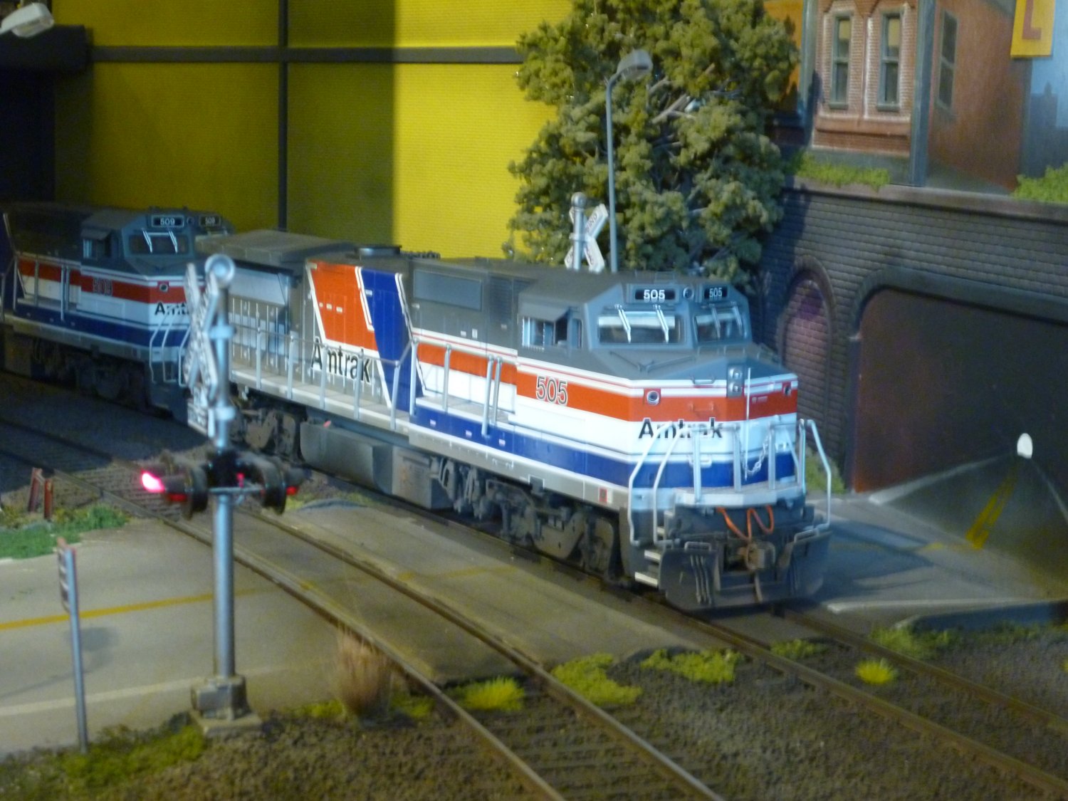 | Amtrak Streamliner with 3 GE Diesels going the opposite direction | |