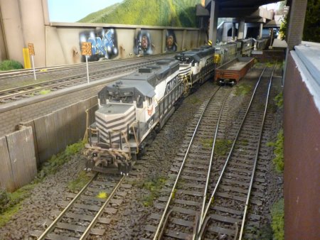 | Modelle, Züge: Der California Zephyr ist fast 10 Meter lang, mit 13 Wagen, dem Vorbild entsprechend und vier F7 Dieselloks der Rio Grande. Verschieden Zuggattungen sind im Einsatz, je nach Lust und Laune. Es bieten sich auch viele Rangiermöglichkeiten auf dem Layout. Der Broadway Limited der Pennsy hat 12 Wagen mit einer dreiteiligen F3 Diesellok. Der Road Railer Zug der NS hat eine Länge von 12 Meter mit zwei Dash8-B der NS. Ich lasse alles mögliche rollen. Doppelstockzüge der Amtrak (Surfliner), Doppelcontainerzüge, Erzzüge, gemischte Güterzüge, etc, der Fantasie sind keine Grenzen gesetzt, selbst der Northlander (ex SBB TEE RAm) ist unterwegs. Der längste mögliche Zug ist ein Kohlezug der Gulf Mobile and Ohio mit vier Loks, 40 Kohlewagen und einer GP35 als Helper am Zugschluss. Der Zug mit einer Länge von fast 16 Meter fährt problemlos über das ganze Layout. Sehr gute Erfahrungen habe ich gemacht mit den Atlas Loks. Ich habe auch fast nur noch Atlas Triebfahrzeuge. Die Zugkraft ist enorm und in all den Jahren ist noch kein einziges Getriebe kaputt gegangen. |