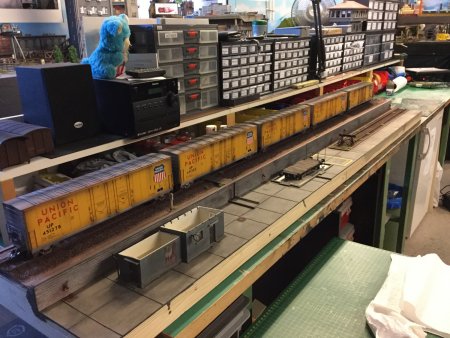 | 324 - Workshop - everything is in order | 302 - Workshop - 5 UP weathered box cars are ready for service |