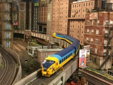 | Why a city theme: The layout is just under 90 square meters large. The topic is a suburb of a larger city somewhere in North America, similar to Chicago where different rail companies come together. No name and the big five. So I can roll pretty much anything I like. This is via UP, BNSF, CP, CN, L&N, Gulf Mobile and Ohio, CSX, Amtrak, Santa Fe, NS, SP, Rio Grande, Pennsy, etc ... The name of the suburb is Calvinsville, a fantasy name. Among close colleagues I have the nickname Calvin, from the comic Calvin and Hobbes. Full of blooming, often absurd fantasies and sometimes a big flap, hence the name. Another place is San Isidro, a service station with lane changes and the subsequent Amtrak depot. Then there is the breakpoint Westwood, similar to Zurich Enge. The train comes directly out of the tunnel and disappears again in such after the stop. 0 scale with the topic US railways and then landscape I find rather difficult. It would take a gym hall to make the issue reasonably believable. In a city skyscrapers are dominate. The trains disappear between the houses and reappear somewhere. That makes it exciting and somehow easier to implement. The level 0 is at 1,2 m from the ground. The 8-track staging yard is at 0,8 m. The highest point is on a bridge with 1,5 m. |