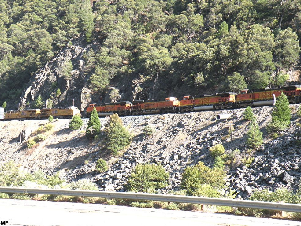 | 8/09 BNSF 7583 EB near Belden - 9194 | 8/09 BNSF 7583 EB emerging from tunnel - 9195 | 8/09 UP 7830 WB - BNSF 7583 EB meet at Camp Rogers Siding - 9196 |