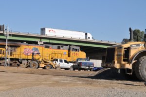 | KPH 6/24/13 An eastward heavy telephoto from Rancho Ave.: The old Colton Depot was where the flyover is at now, somewhere across from the train’s head end in this view. - 4035 | KPH 6/26/13 Even though Main 1 is in service over the flyover, much equipment is working by the east slope. - 4158 | KPH 6/26/13 Heavy work by the east slope - 4172 |