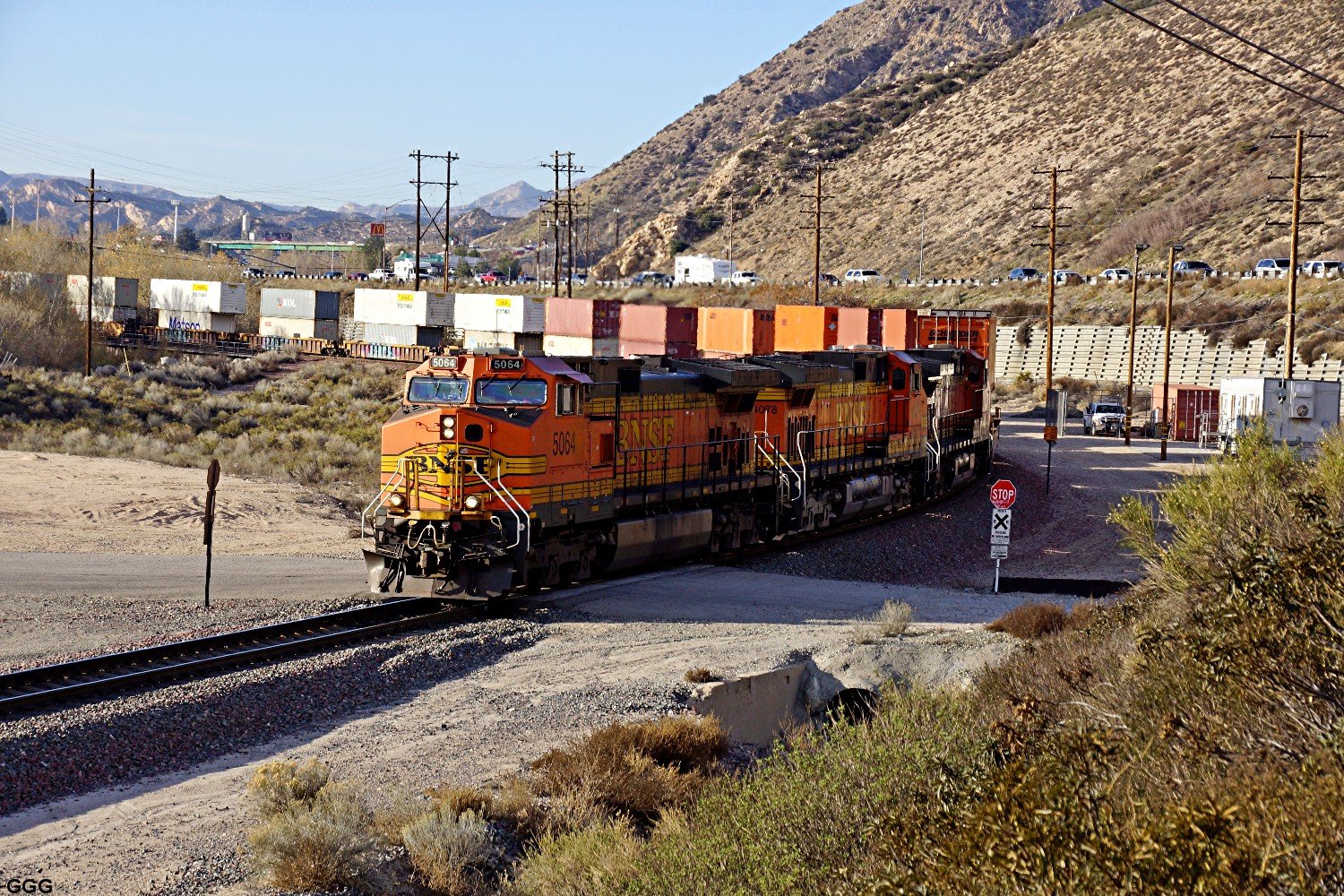 # 5091-5092: UP 7879 is WB between Sullivans and Cajon Jct. # 5093: BNSF 5064 WB on MT-3 into Cajon Jct. # 5094: BNSF 6960 E @ Hill 582. # 5095: BNSF 7826 EB on MT-3 @ West Summit Island. # 5096: BNSF 8158 WB on MT-2 @ WSI. # 5097: UP 6584 EB on MT-1 @ WSI. # 5098-5099: MOW near East Victorville required single tracking between Oro Grande & Frost. The eastbound waited for several WB's to clear. # 5100: After waiting for an hour, BNSF 6537 East (mentioned in # 5098 & # 5099) proceeds to Barstow. # 5101-5102: BNSF Barstow West Yard and the Diesel Service Facility. GGG |