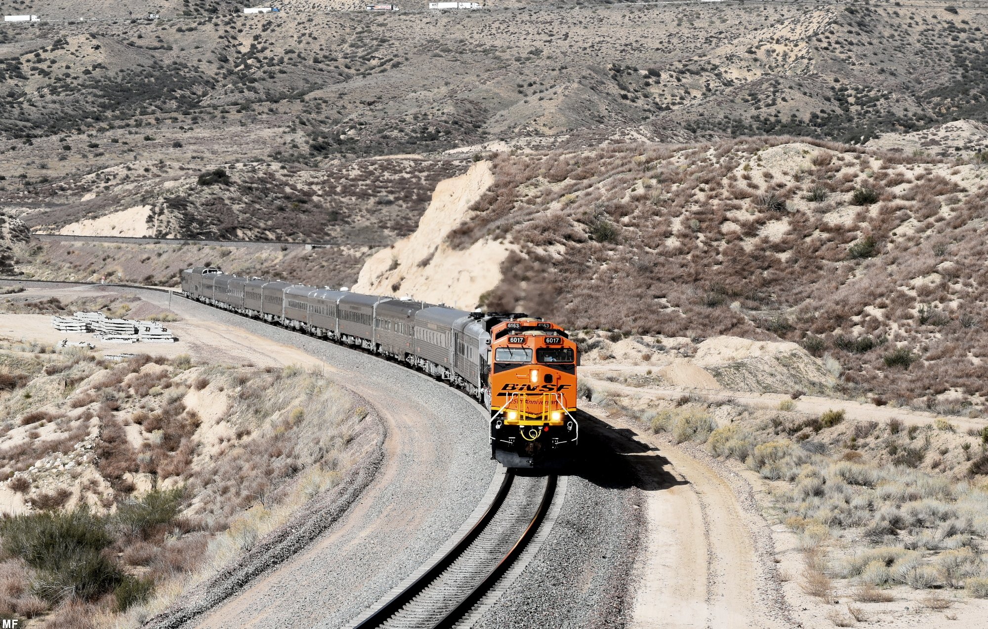 | #1101-1105: Polished BNSF #6017 & #6163, EB with 13 car Officers Special, climb MT #3 and pass West Summit Island @ MP 56.7 | |