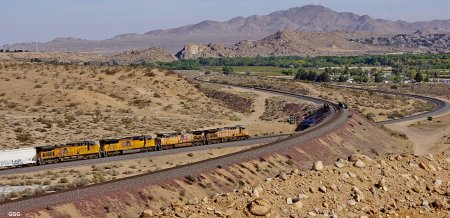 | RS-2201 - Having topped the hill at Erie, NV a few miles back this westbound coal load is led by KCS 4578 as it approaches Jean, NV. | RS-2202 - Climbing the grade out of the Vegas the westbound MOGWC can be seen all stretched out at the west end of Sloan, NV. |