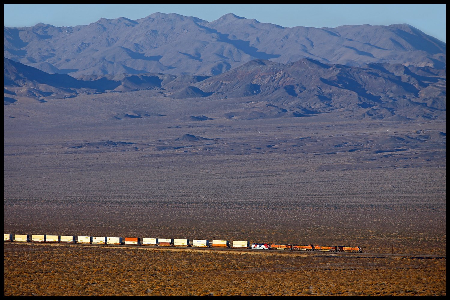 Subdivision that information sure sealed up those plans. For those who may not know, last year BNSF donated the SD45-2 to the Southern California Railroad Museum in Perris, California. Before the locomotive was shipped west from Kansas the old SD45-2 was meticulously returned to its mid-1970s appearance, including a return of the striking red, white, and blue colors used by the Santa Fe to celebrate the Bicentennial in 1976. My dad drove out and met me at Ludlow at sunrise and together we made the trek out to Klondike on the east side of Ash Hill. We then followed the train west towards Victorville on the Cajon Subdivision. BNSF was experiencing some significant congestion on the Needles and Cajon Subs so it was somewhat slow progress despite being on a Z train. Still, the day was great fun, made better by seeing 5704 arrive in SoCal with my dad. |