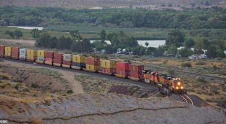 4015 A sight seldom seen lately---BNSF 6032 leads a FULL stack train down the 3+% grade of what is now BNSF MainTrack (MT-3). Most heavy trains now use BNSF Mains MT-1 & MT-2 which are around 2%, leaving MT-3 for light stuff like AMTRAK. |