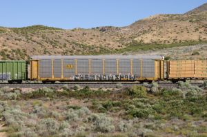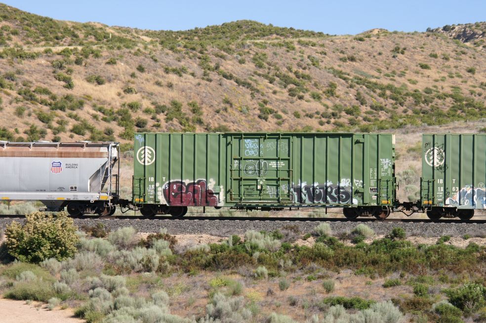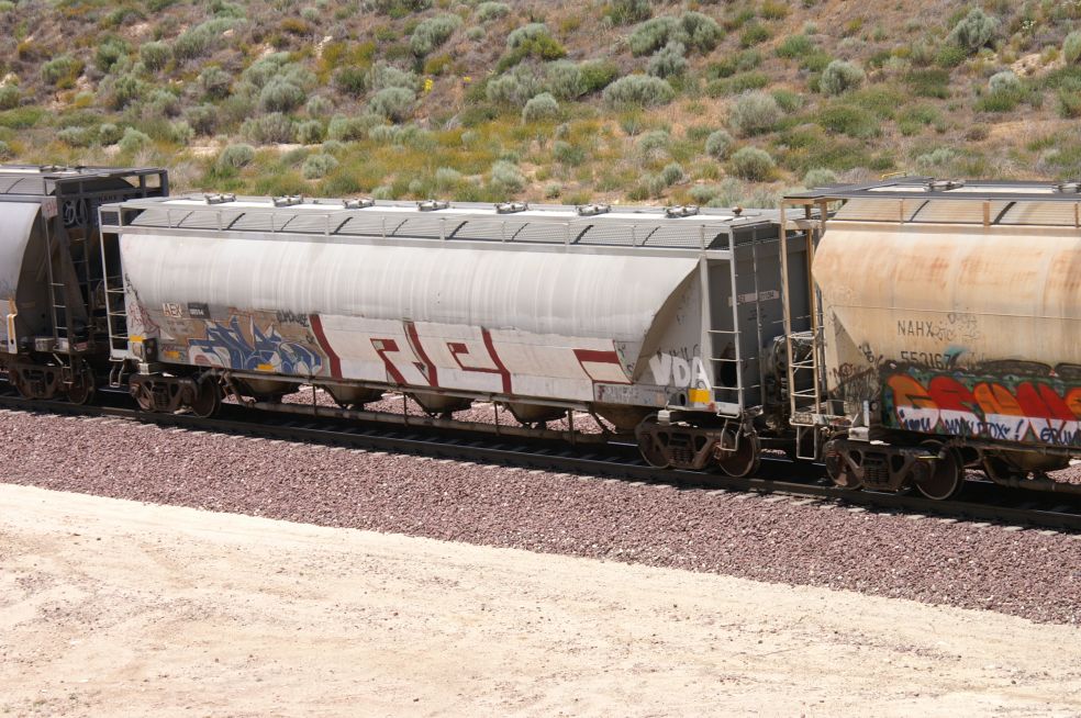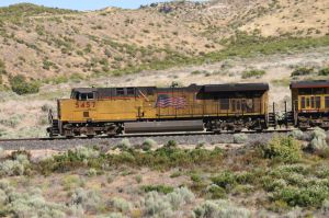 | Train no. 4 is coming thru the cut on the UPT (UP Palmdale cutoff). There are lots of cars with graffiti and therfore, I made too many photos. | ||