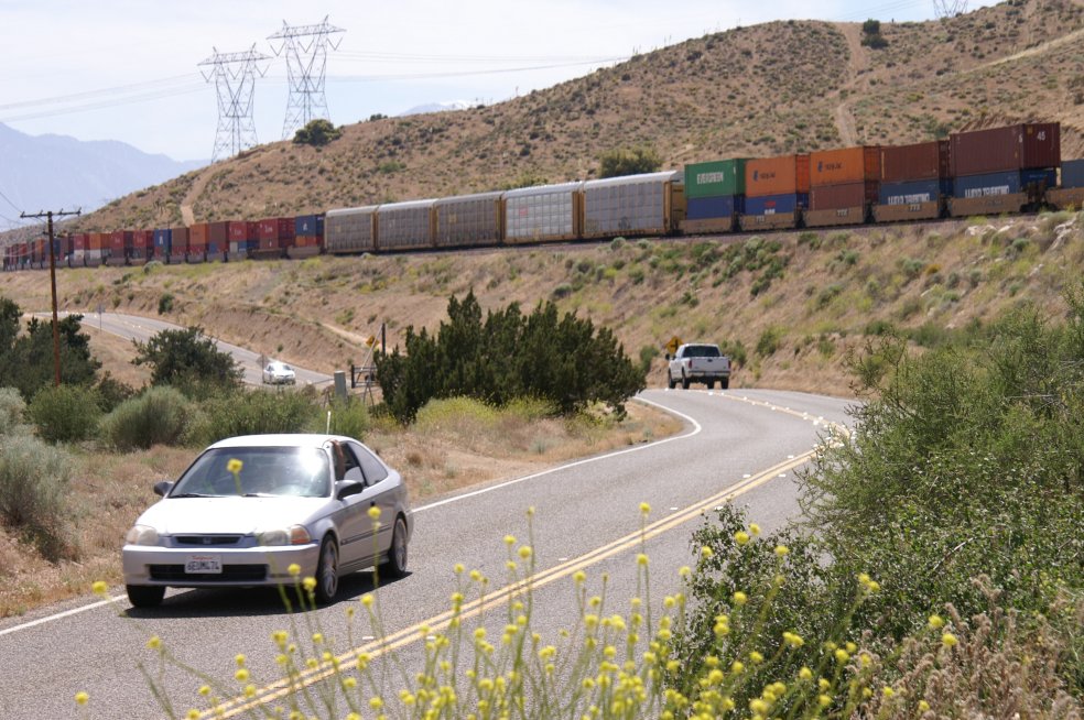 | June 2, 2010: As we are driving on Summit Valley Road coming from Hesperia, we got a UP EB train on BNSF tracks at Lugo (East of Summit) | ||