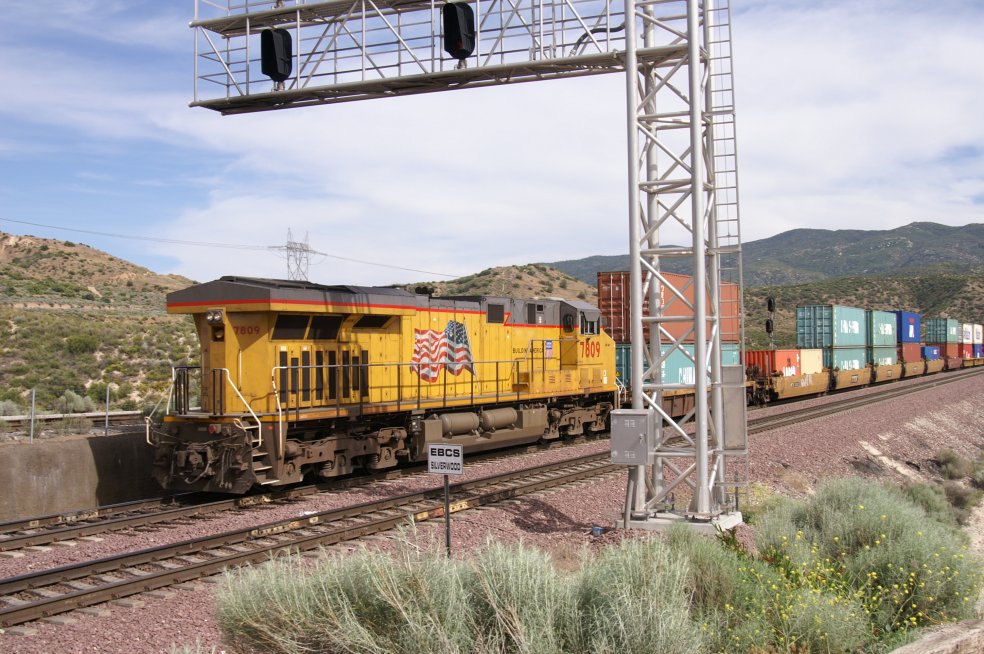 | it is rolling under the signal bridge - 4291 | UP is having trackage rights on BNSF . . . - 4292 | . . . from San Bernardino to Daggett - 6736 MM |