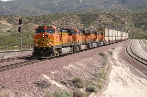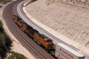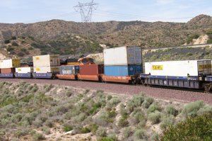 | 6/02/10: West Summit Island MP 56.7 (WSI) is below Summit Curve and between BNSF MT-1/2 and MT-3. This location is actually Silverwood. A great place to watch trains close up. We can also see the Silverwood Connector which connects BNSF MT-1 with the UPT. Therefore, UP can switch trains coming from Colton Yard to Barstow and Daggett (both directions). All photos were taken from WSI (see photos at the end). | ||