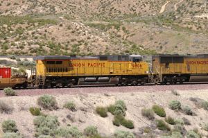 | UP 4122 = EMD SD70M, built 2000 - 2494 | UP 9806 = GE C44-9W, built 1994 - 2495 | the engines are crossing Powerline Road - 2496 |