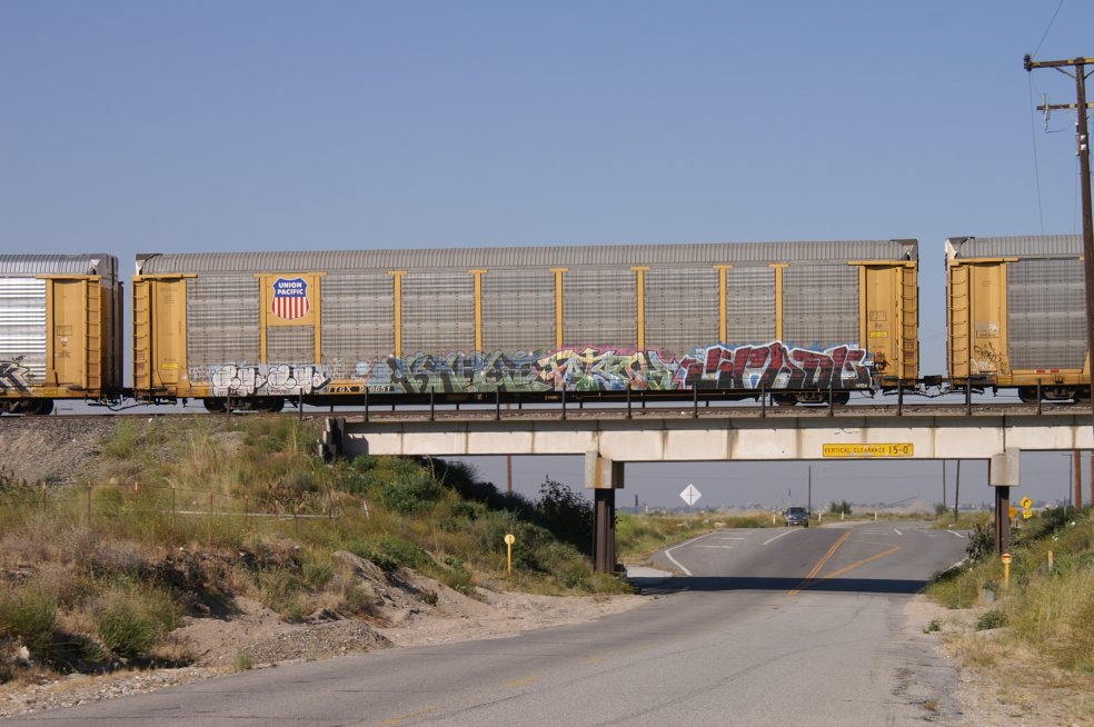 | On Monday, May 31, 2010, every day, we took breakfast at Denny's on Palm Ave. We just crossed the BNSF tracks and Cajon Blvd. and saw a UP SB all auto carriers coming down from Cajon on UP tracks, heading for Colton Yard. In perfect morning light, we can see several auto racks with graffiti. | ||