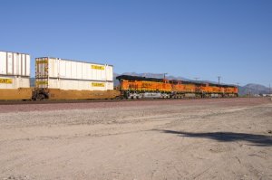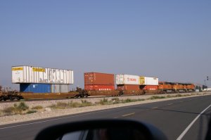 | On June 4, 2010, we drove down Cajon Blvd. to Kenwood Ave., used quickly I-15 (I-215) and took Devore Road exit to continue Cajon Blvd. Just before Palm Ave. crossing (Verdemont), we met the very same BNSF WB intermodal train we took photos of at Cajon Station. As there was no more time to get off the car, I lowered the front window and just took some photos. Even it was the same train, it still makes fun to see it along Cajon Blvd. (old Route 66). | ||