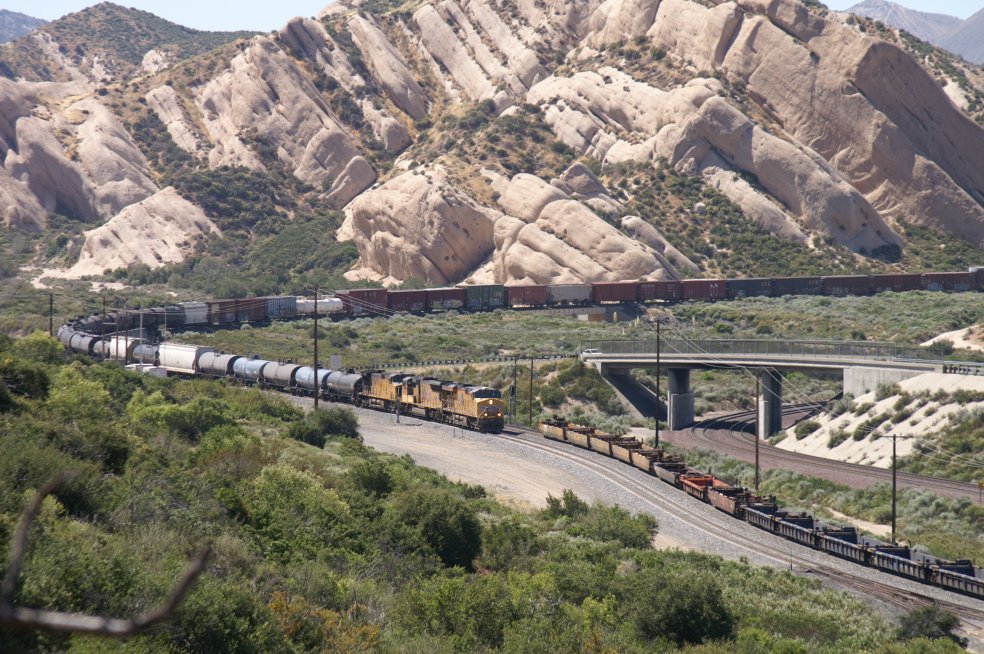 | I took a lot of photos of Train 8, a UP SB manifest coming down on UP's Colton-Palmdale Cutoff. The first photo (1715) shows this UP train coming from the Mormon Rocks / Highway 138 toward Sullivans Curve. On 1716, it will enter Sullivans Curve and I made several pictures with the famous rock formations (probably too many). If it is too much for you, just scroll down. (total of 36 photos) | ||